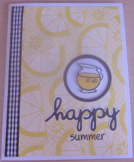 The layering paper was some K & Company that I had for years. I remember loving that collection and wish I had more of it. The pitcher of lemonade is a Lawn Fawn stamp that I fussy cut after I embossed and colored it. I added some Wink of Stellar to it to make it sparkle. I backed the image with foam tape to make it really stand out. Notice the shadow effect I created for the "happy" sentiment.